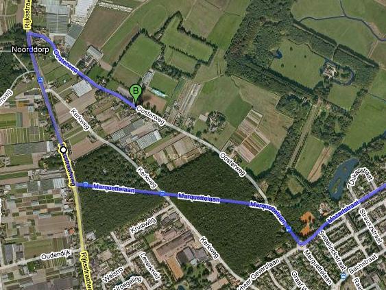 U rijdt door totdat u weer voor een T-kruising voorrangsweg staat. Daar gaat u rechtsaf. Als u na ongeveer 0.5 km de verkeerslichten in het oog krijgt, wordt het opletten geblazen. U moet 150 meter voorbij deze lichten rechtsaf een smal weggetje in: de Oosterweg. Dit volgt u en weldra krijgt u het sportpark De Vlotter aan uw linkerhand.